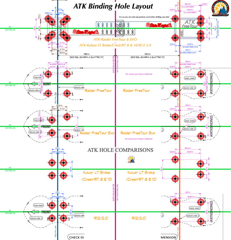 In the interest of consolidating and organizing the various ATK Binding Hole Patterns here is a PDF to use for comparing. Please let us know if you find any errors. The top pattern is the composite pattern used for our ATK Binding Layout Tool: